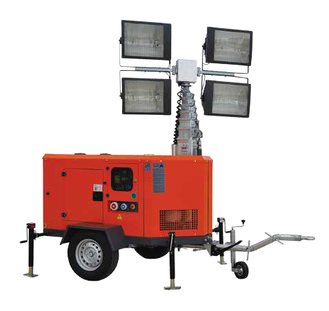 Generator set is mounted on a trailer with a torsion axle, automatic braking equipment. There are 4-6 pieces of metal halide projector. Vertical tower is galvanized, mechanically reaches a height of 9 m. Each set has four pillars of stability. Each lamp consists of on/off switches There is a 220 V. socket on a protection canopy.